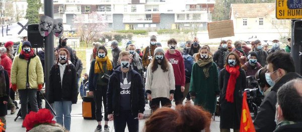 Comme annoncé, les intermittents qui occupent le CDN ont donné rendez-vous aux bisontins dimanche 21 mars 2021 à la Cité des Arts pour un rassemblement- spectacle. Il y a eu un temps de « Flashdanse » un peu carnaval, des discours et un temps de silence (croix noires sur les masques).